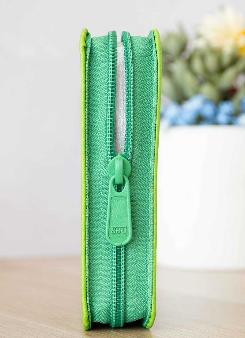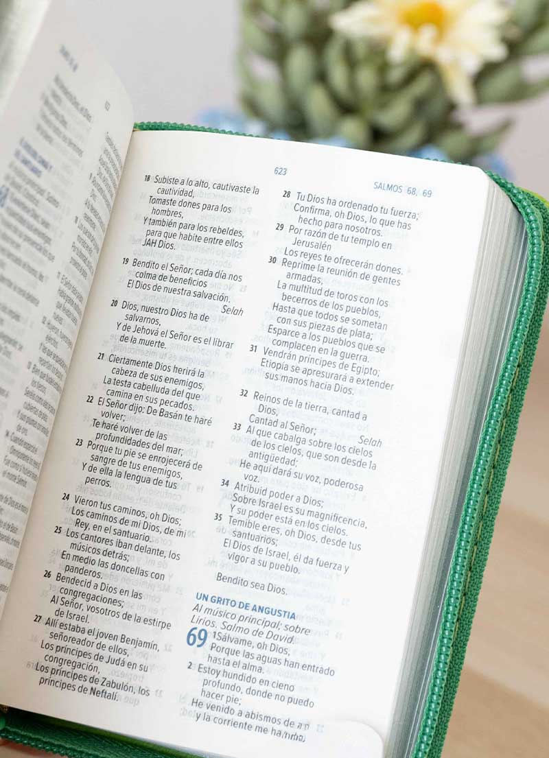 La Biblia Reina Valera 60 tamaño mini bolsillo será tu compañía en todo lugar, su cubierta moderna y juvenil creada en un material flexible con cremallera que le permite ser resistente al agua. En el interior de sus páginas encontraras la Biblia con una tipografía que a pesar de su tamaño (Pequeño) permite una lectura agradable y amena. Su cubierta maneja un color verde y finas líneas y letras grabas que le dan mayor elegancia.